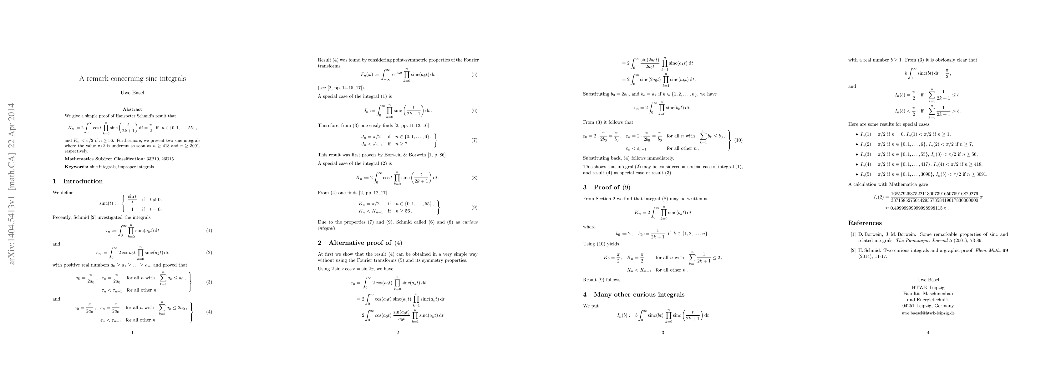 This paper provides a simplified proof for Hanspeter Schmid's result about sinc integrals, confirming K_n = π/2 for n up to 55, and showing K_n < π/2 for n ≥ 56. It also introduces two new integrals undercutting π/2 values for n ≥ 418 and n ≥ 3091, respectively.