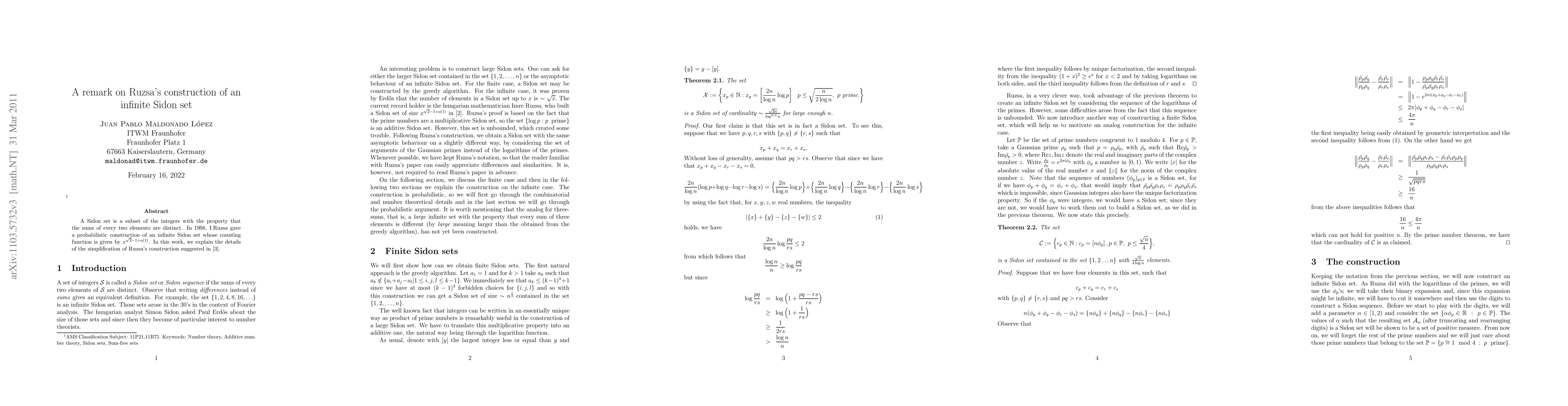 This paper provides a detailed and simplified proof of I. Ruzsa's probabilistic construction of an infinite Sidon set, as suggested by Ruzsa and J. Cilleruelo in their 2004 paper on real and p-adic Sidon sequences. The work clarifies the methodology behind Ruzsa's original construction.