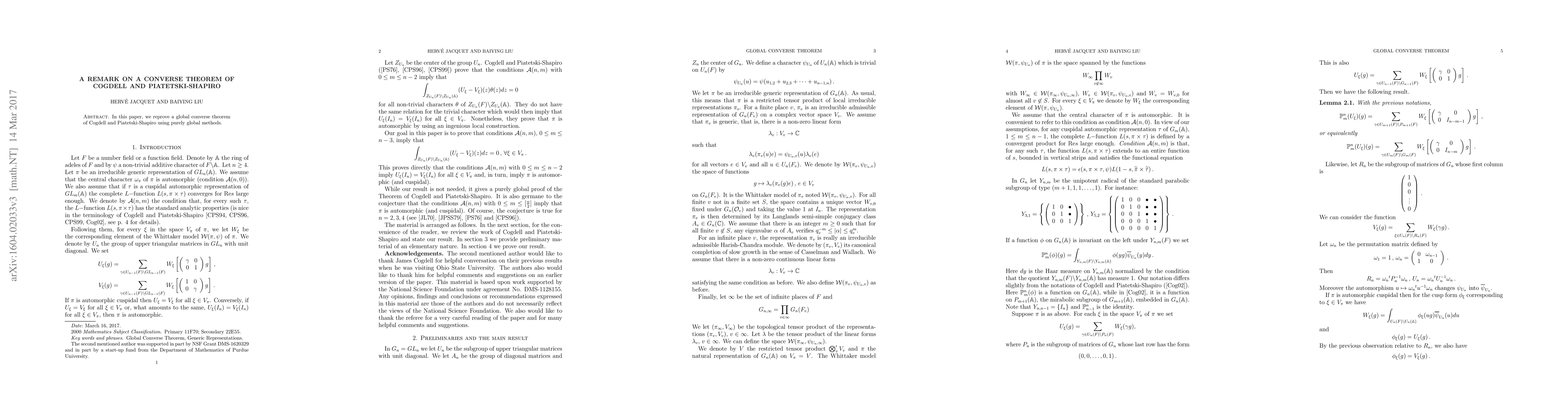 Summary: This paper reproves a global converse theorem originally established by Cogdell and Piatetski-Shapiro, utilizing purely global techniques instead of relying on local methods. The focus is on demonstrating the theorem through global analytic methods.