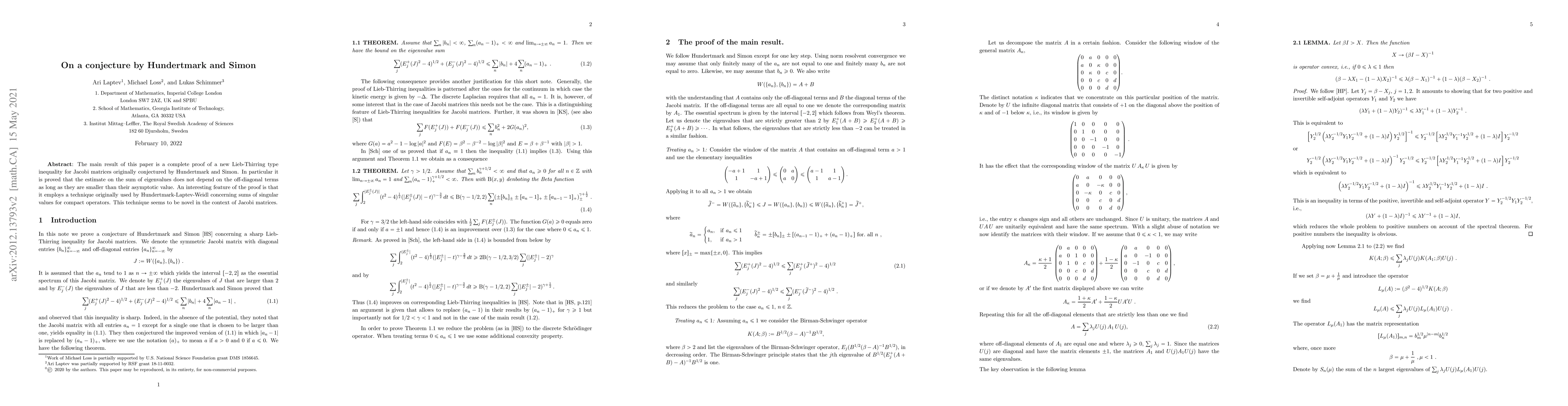 We prove a sharp Lieb-Thirring type inequality for Jacobi matrices, thereby settling a conjecture of Hundertmark and Simon. An interesting feature of the proof is that it employs a technique originally used by Hundertmark-Laptev-Weidl concerning sums of singular values for compact operators.