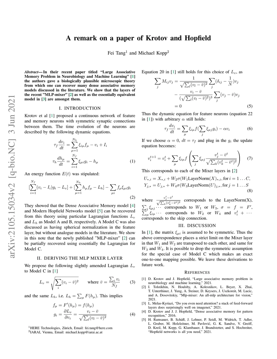 In their recent paper titled "Large Associative Memory Problem in Neurobiology and Machine Learning" [arXiv:2008.06996] the authors gave a biologically plausible microscopic theory from which one can recover many dense associative memory models discussed in the literature. We show that the layers of the recent "MLP-mixer" [arXiv:2105.01601] as well as the essentially equivalent model in [arXiv:2105.02723] are amongst them.