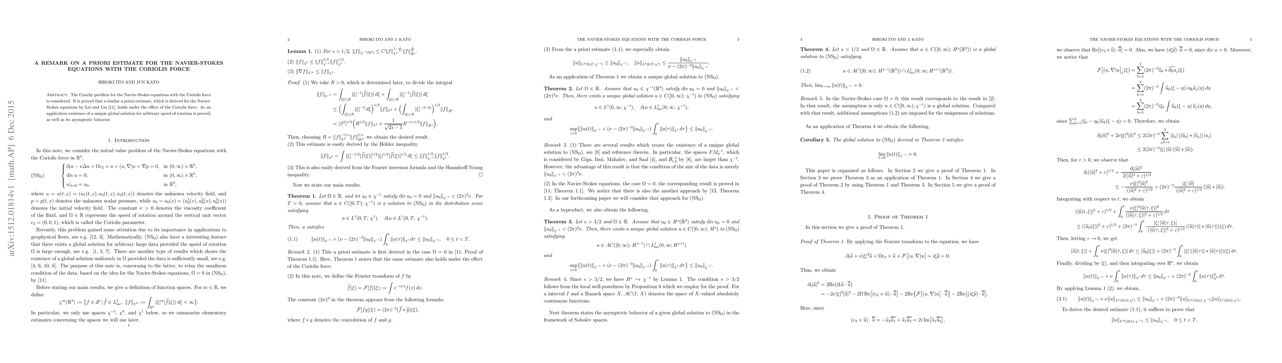 This paper proves that an a priori estimate for the Navier-Stokes equations, originally derived by Lei and Lin, remains valid under the influence of the Coriolis force. It demonstrates the existence of a unique global solution for any rotational speed and analyzes its asymptotic behavior.
