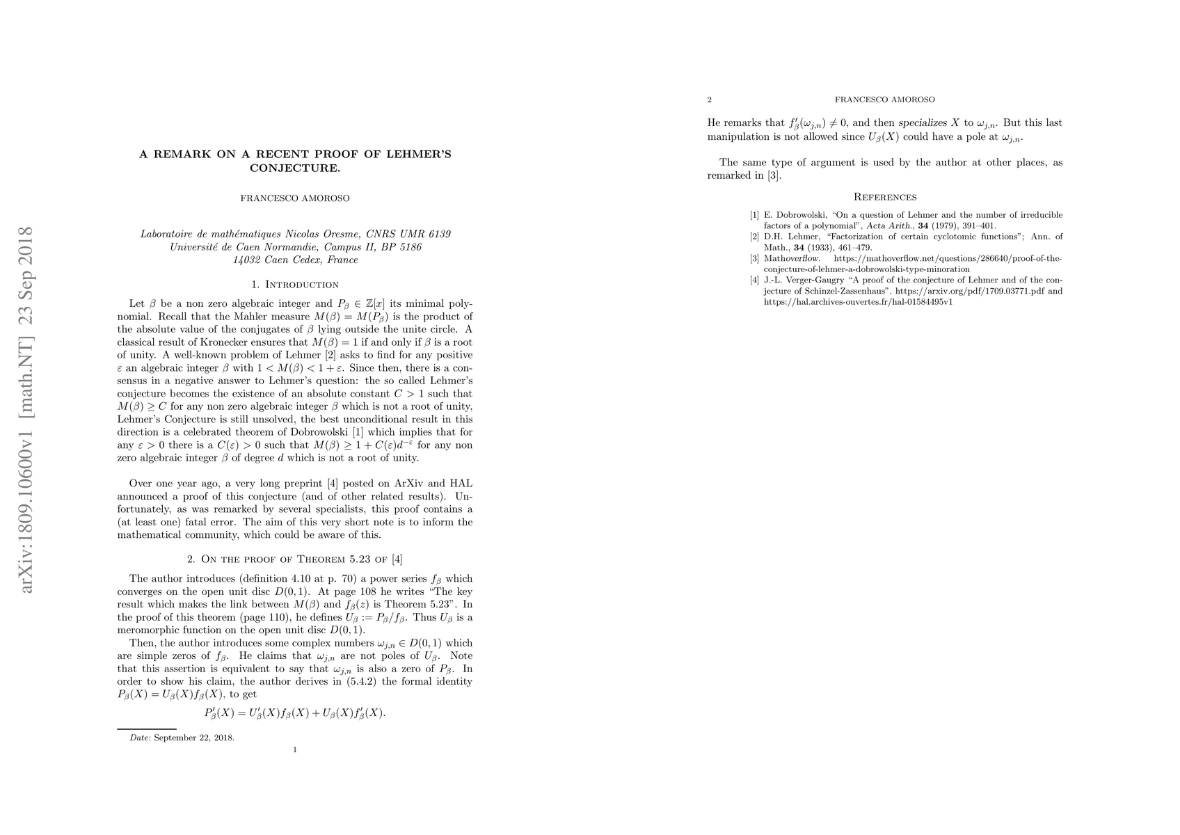 Over one year ago, a very long preprint posted on arXiv [arXiv:1709.03771] and HAL announced a proof of Lehmer's Conjecture (and of other related results). Unfortunately, as was remarked by several specialists, this proof contains a (at least one) fatal error. The aim of this very short note is to inform the mathematical community, which could be aware of this.