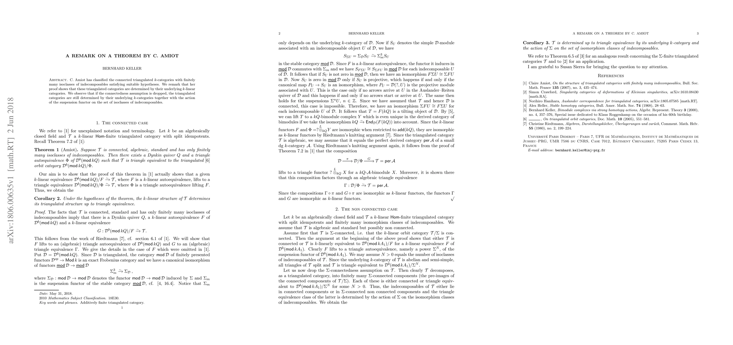 C. Amiot has classified the connected triangulated k-categories with finitely many isoclasses of indecomposables satisfying suitable hypotheses. We remark that her proof shows that these triangulated categories are determined by their underlying k-linear categories. We observe that if the connectedness assumption is dropped, the triangulated categories are still determined by their underlying k-categories together with the action of the suspension functor on the set of isoclasses of indecomposables.