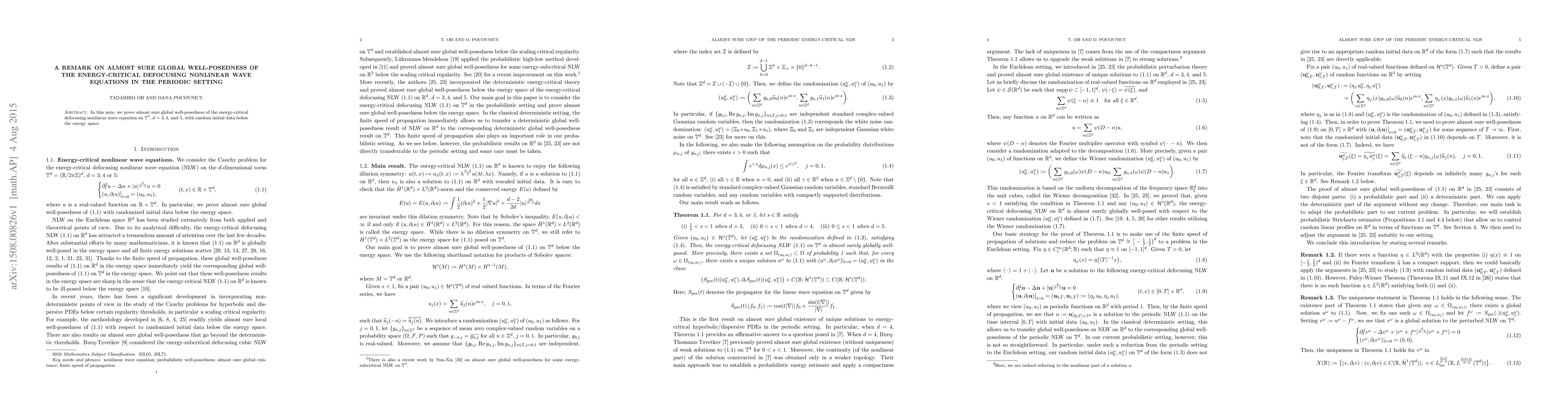 In this note, we prove almost sure global well-posedness of the energy-critical defocusing nonlinear wave equation on $\mathbb{T}^d$, $d = 3, 4,$ and $5$, with random initial data below the energy space.
