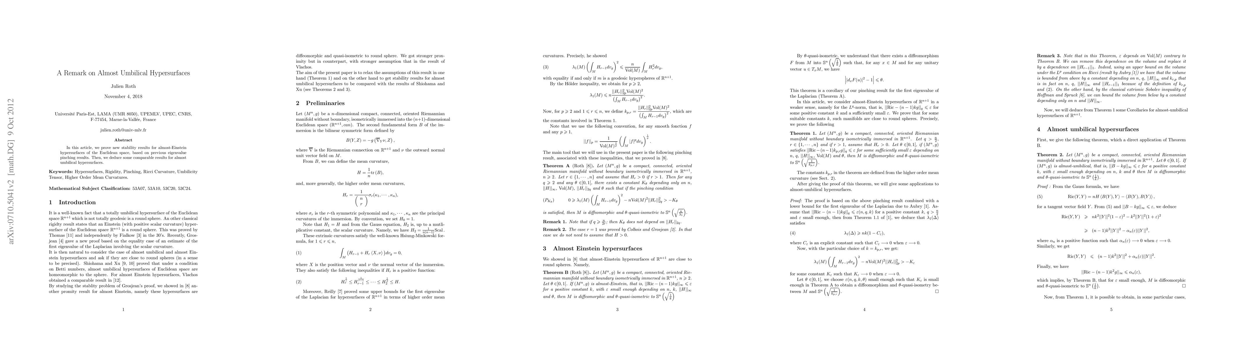 In this article, we prove new stability results for almost-Einstein hypersurfaces of the Euclidean space, based on previous eigenvalue pinching results. Then, we deduce some comparable results for almost umbilical hypersurfaces.