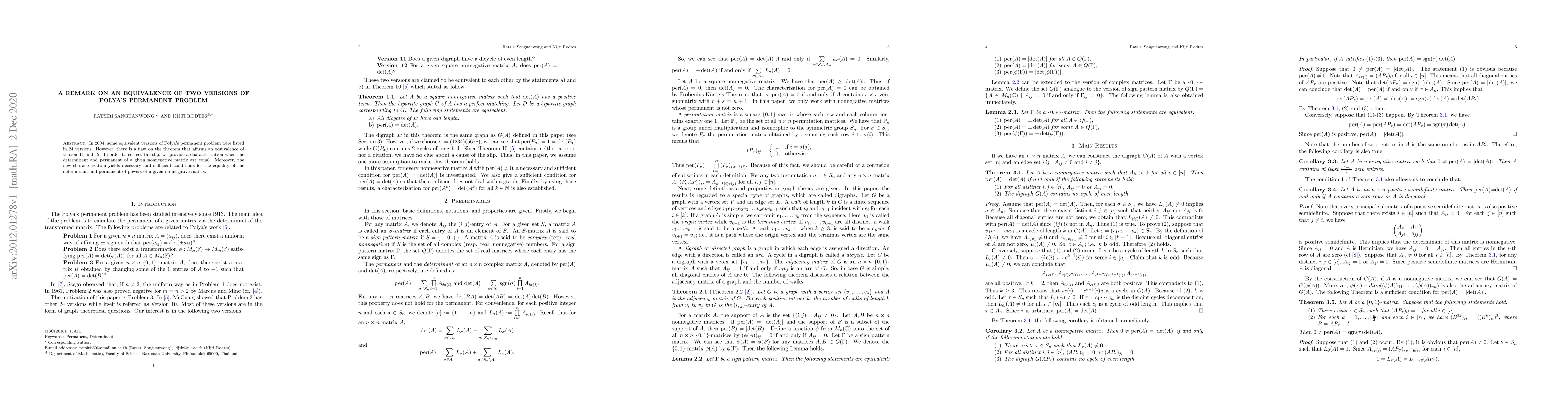 In 2004, some equivalent versions of Polya's permanent problem were listed in 24 versions. However, there is a flaw on the theorem that affirms an equivalence of version 11 and 12. In order to correct the slip, we provide a characterization when the determinant and permanent of a given nonnegative matrix are equal. Moreover, the new characterization yields necessary and sufficient conditions for the equality of the determinant and permanent of powers of a given nonnegative matrix.