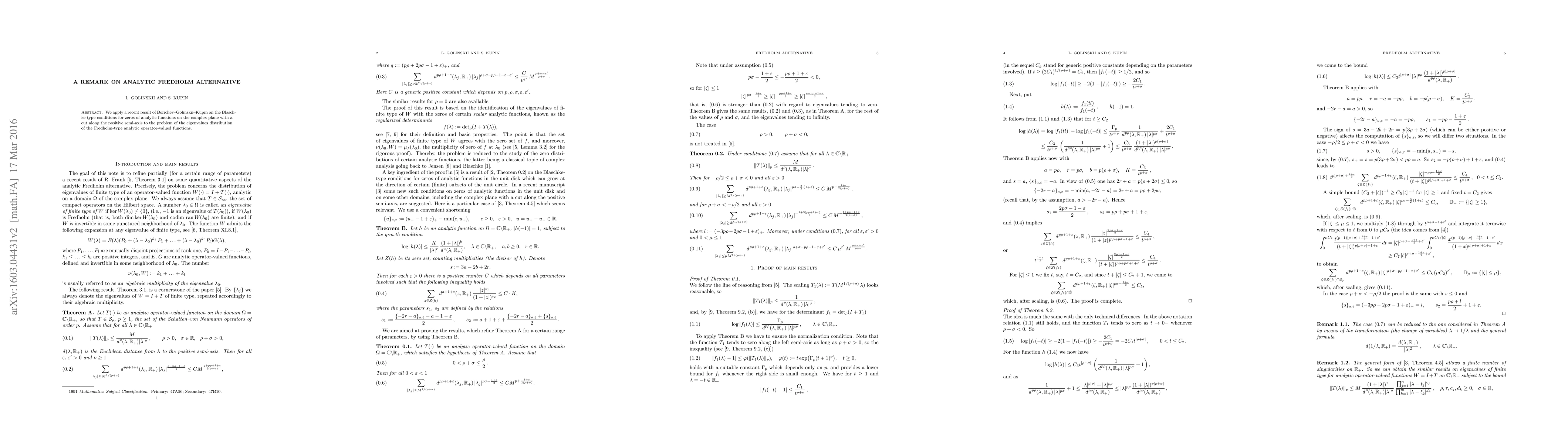 This paper applies a recent result to study the distribution of eigenvalues for Fredholm-type analytic operator-valued functions, focusing on conditions related to zeros of analytic functions with a cut along the positive semi-axis.