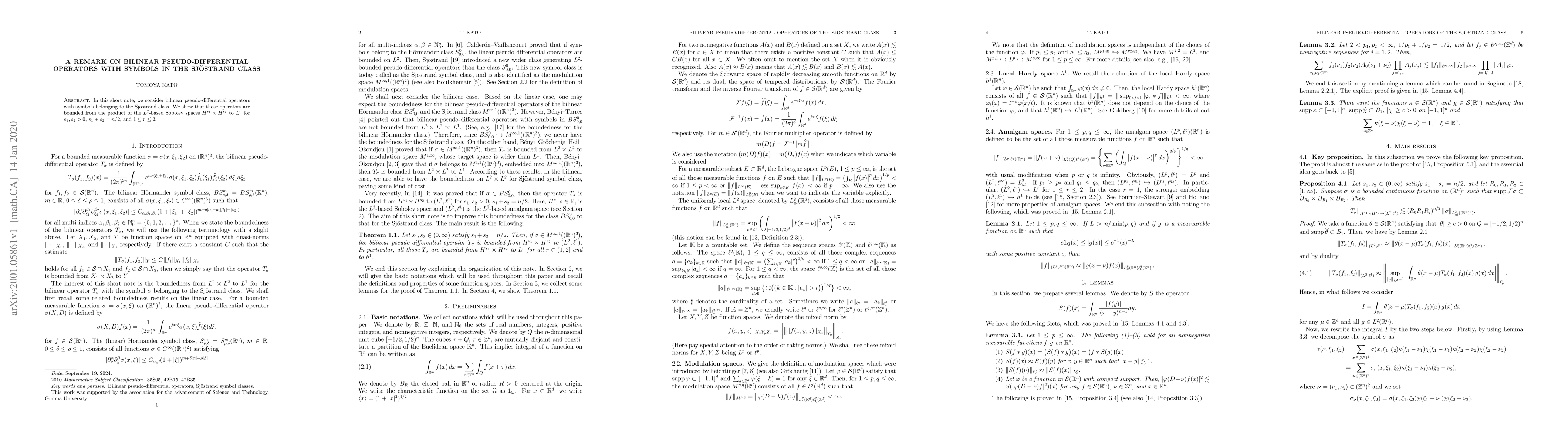 In this short note, we consider bilinear pseudo-differential operators with symbols belonging to the Sj\"ostrand class. We show that those operators are bounded from the product of the $L^2$-based Sobolev spaces $H^{s_1} \times H^{s_2}$ to $L^r$ for $s_1,s_2 > 0$, $s_1+s_2=n/2$, and $1 \leq r \leq 2$.