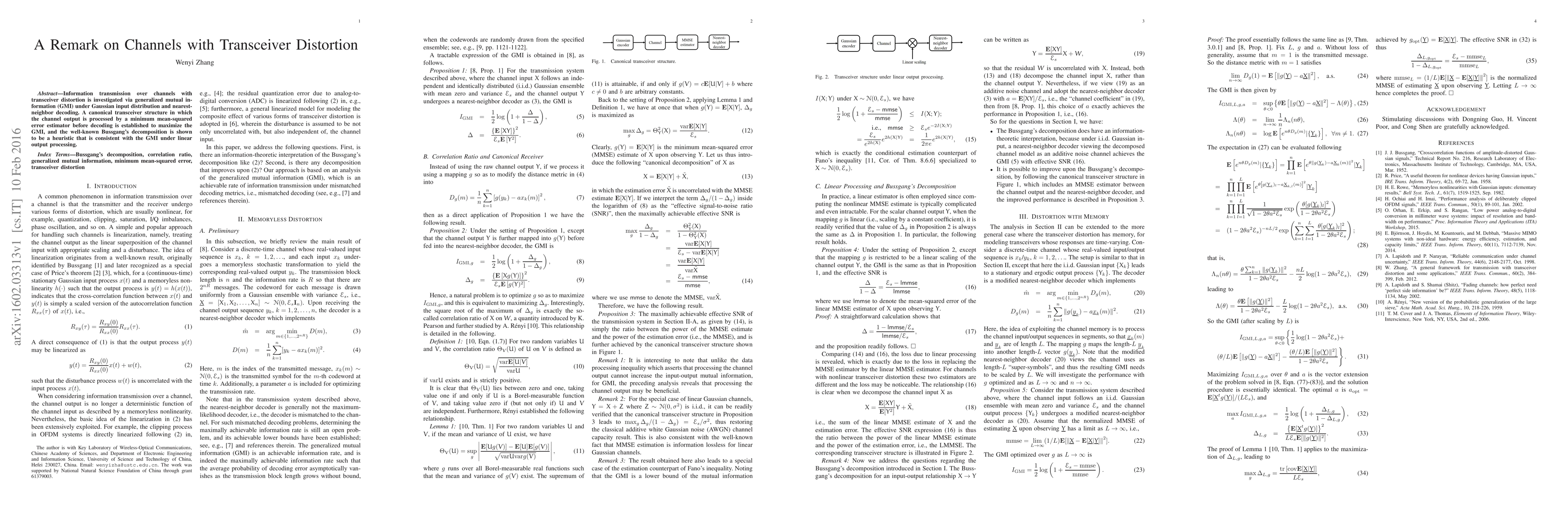 This paper investigates information transmission over channels with transceiver distortion using generalized mutual information under Gaussian input and nearest-neighbor decoding. It establishes a canonical transceiver structure to maximize GMI and shows that Bussgang's decomposition aligns with GMI under linear output processing.