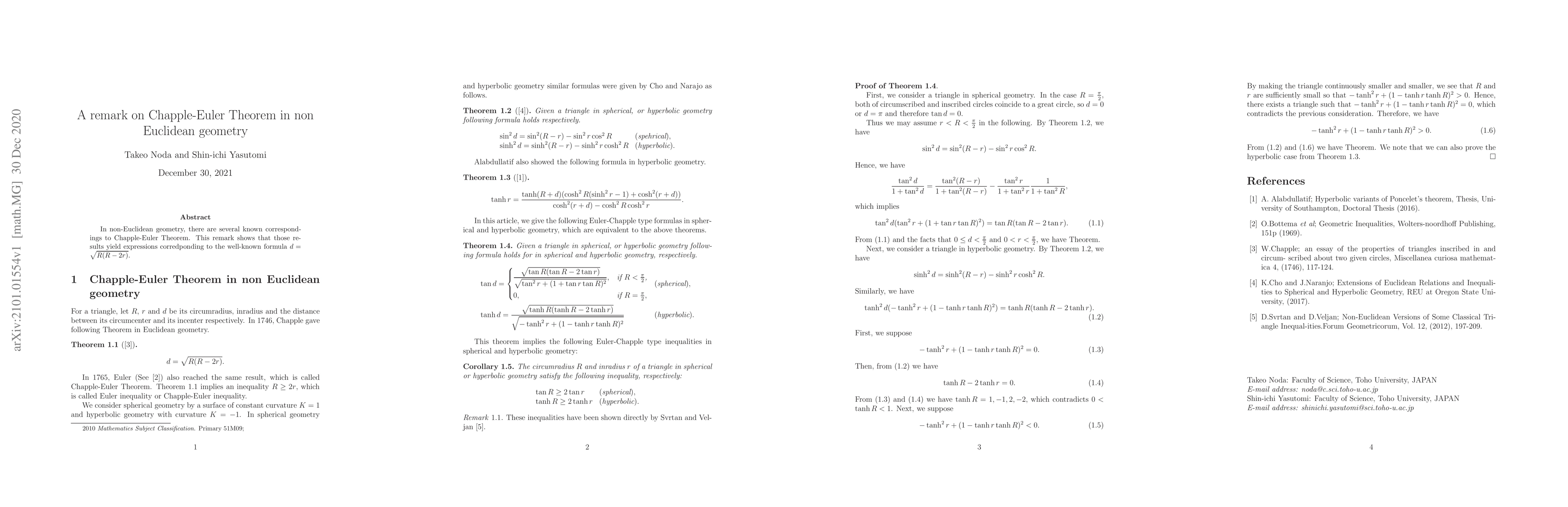 In non-Euclidean geometry, there are several known correspondings to Chapple-Euler Theorem. This remark shows that those results yield expressions corredponding to the well-known formula $d=\sqrt{R(R-2r)}$.