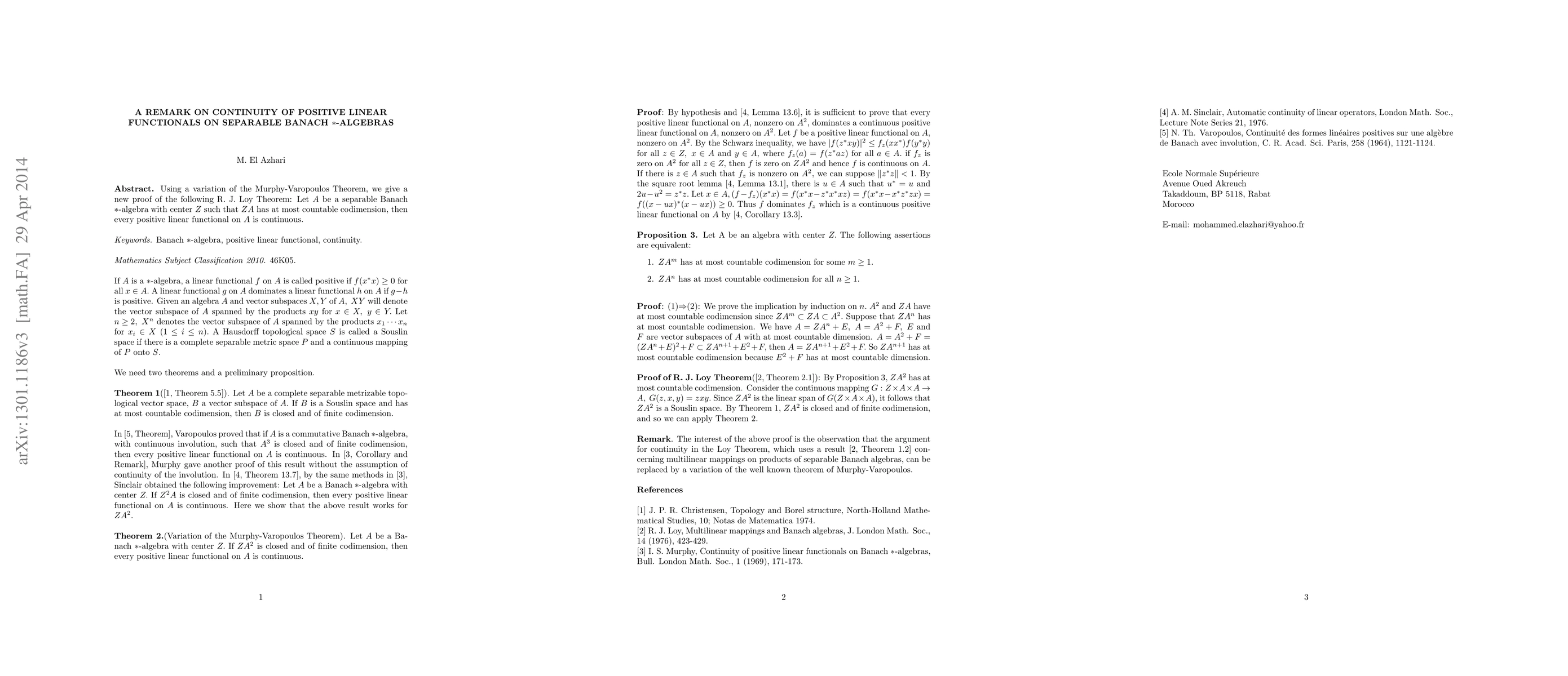 Using a variation of the Murphy-Varopoulos Theorem, we give a new proof of the following R.J.Loy Theorem: Let A be a separable Banach*-algebra with center Z such that ZA has at most countable codimension, then every positive linear functional on A is continuous.