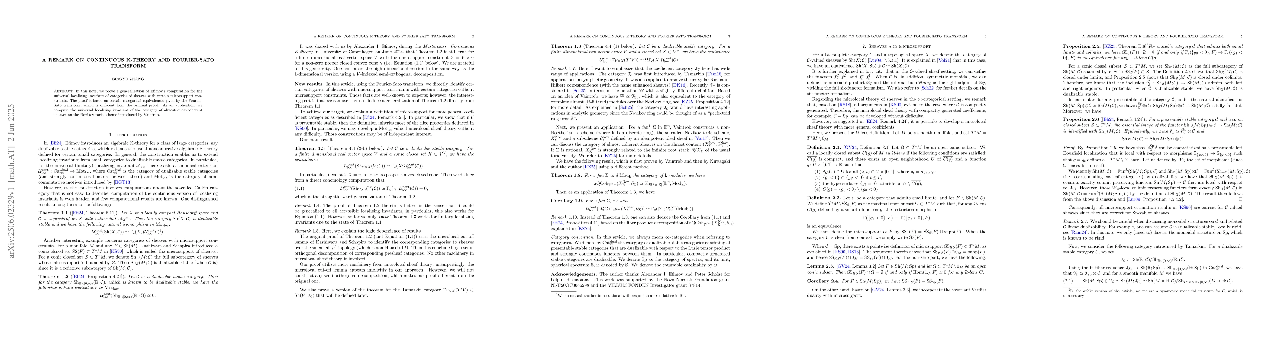 In this note, we prove a generalization of Efimov's computation for the universal localizing invariant of categories of sheaves with certain microsupport constraints. The proof is based on certain categorical equivalences given by the Fourier-Sato transform, which is different from the original proof. As an application, we compute the universal localizing invariant of the category of almost quasi-coherent sheaves on the Novikov toric scheme introduced by Vaintrob.
