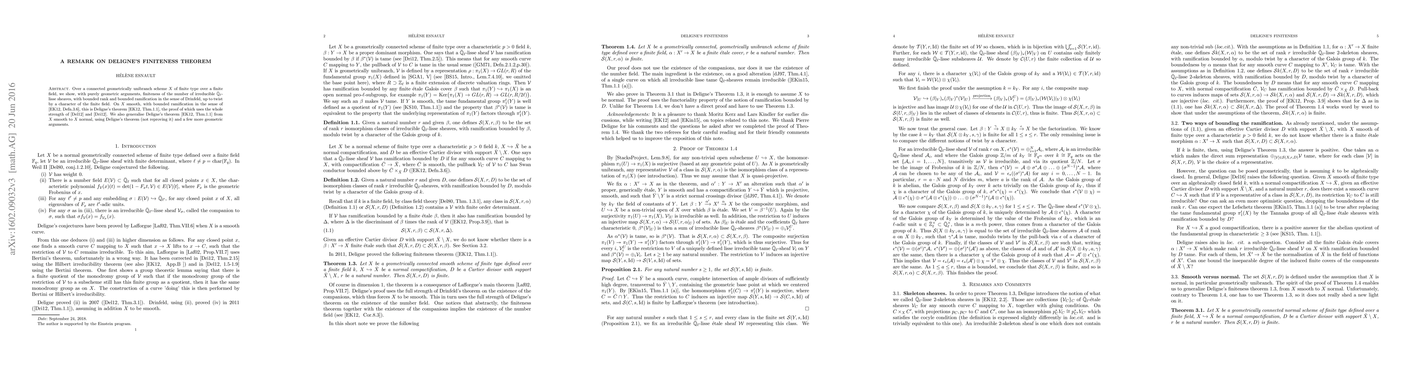 The paper proves finiteness of irreducible $\bar{\Q}_\ell$-lisse sheaves with bounded rank and ramification on a connected geometrically unibranch scheme over a finite field, extending Deligne's theorem to normal schemes.