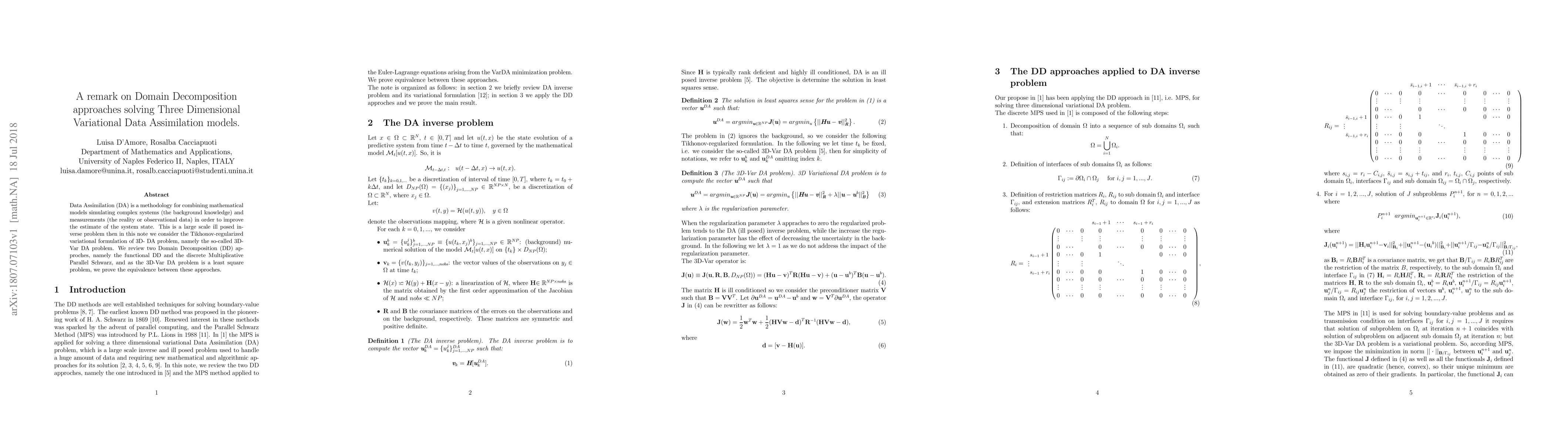 Data Assimilation (DA) is a methodology for combining mathematical models simulating complex systems (the background knowledge) and measurements (the reality or observational data) in order to improve the estimate of the system state. This is a large scale ill posed in- verse problem then in this note we consider the Tikhonov-regularized variational formulation of 3D- DA problem, namely the so-called 3D- Var DA problem. We review two Domain Decomposition (DD) approaches, namely the functional DD and the discrete Multiplicative Parallel Schwarz, and as the 3D-Var DA problem is a least square problem, we prove the equivalence between these approaches.