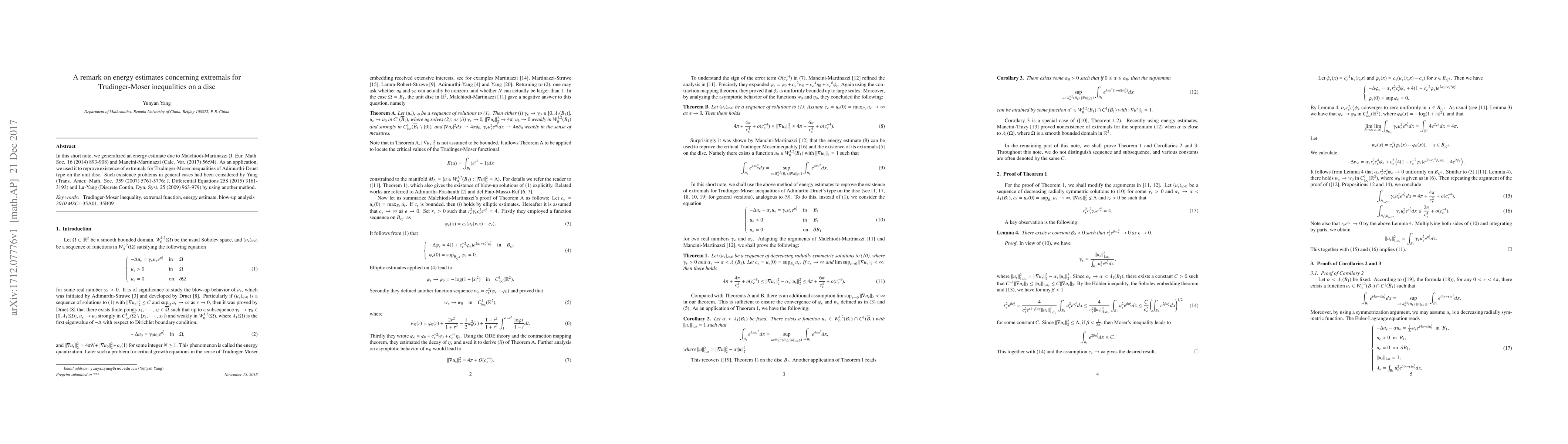 In this short note, we generalized an energy estimate due to Malchiodi-Martinazzi (J. Eur. Math. Soc. 16 (2014) 893-908) and Mancini-Martinazzi (Calc. Var. (2017) 56:94). As an application, we used it to reprove existence of extremals for Trudinger-Moser inequalities of Adimurthi-Druet type on the unit disc. Such existence problems in general cases had been considered by Yang (Trans. Amer. Math. Soc. 359 (2007) 5761-5776; J. Differential Equations 258 (2015) 3161-3193) and Lu-Yang (Discrete Contin. Dyn. Syst. 25 (2009) 963-979) by using another method.