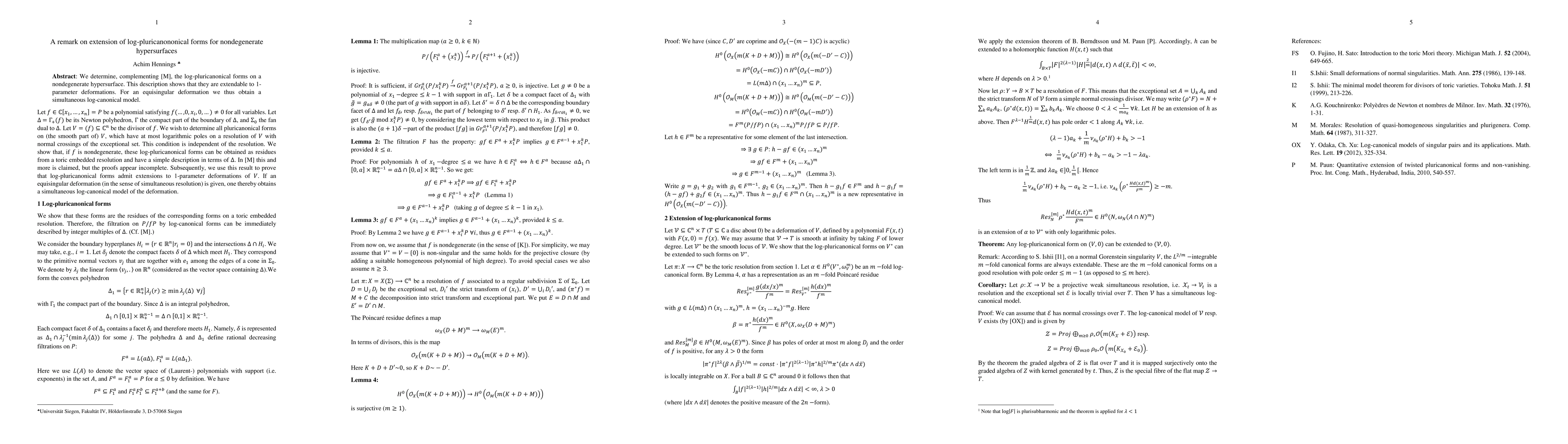 Summary: This paper extends the log-pluricanonical forms on nondegenerate hypersurfaces, confirming their extendability to 1-parameter deformations, and provides a simultaneous log-canonical model for equisingular deformations, complementing previous work by Marcel Morales.