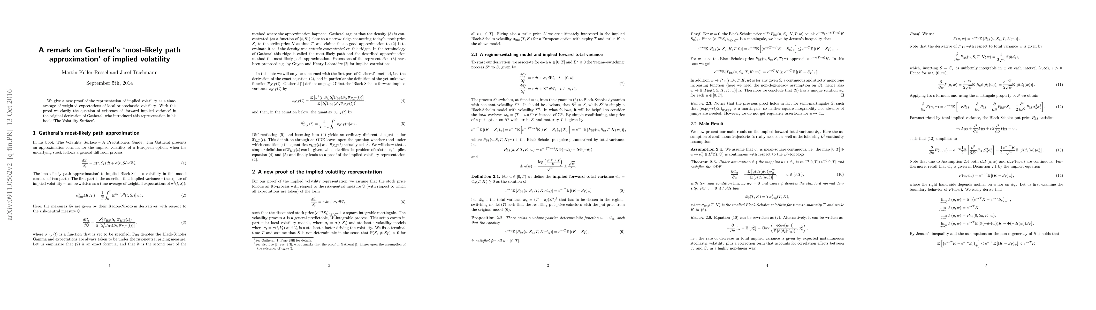 Summary: This paper presents a new proof for the representation of implied volatility as a time-average of weighted expectations of local or stochastic volatility, clarifying the existence of 'forward implied variance' in Gatheral's original derivation.