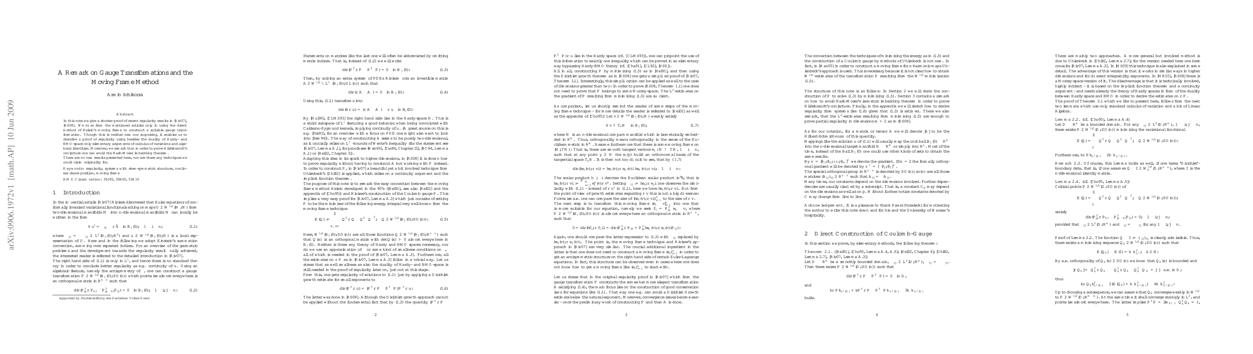 In this note we give a shorter proof of recent regularity results by Riviere and Riviere-Struwe. We differ from the mentioned articles only in using the direct method of Helein's moving frame to construct a suitable gauge transformation. Though this is neither new nor surprising, it enables us to describe a proof of regularity using besides the duality of Hardy- and BMO-space only elementary arguments of calculus of variations and algebraic identities. Moreover, we remark that in order to prove Hildebrandt's conjecture one can avoid the Nash-Moser imbedding theorem. There are no new results presented here, nor are there any techniques we could claim originality for.