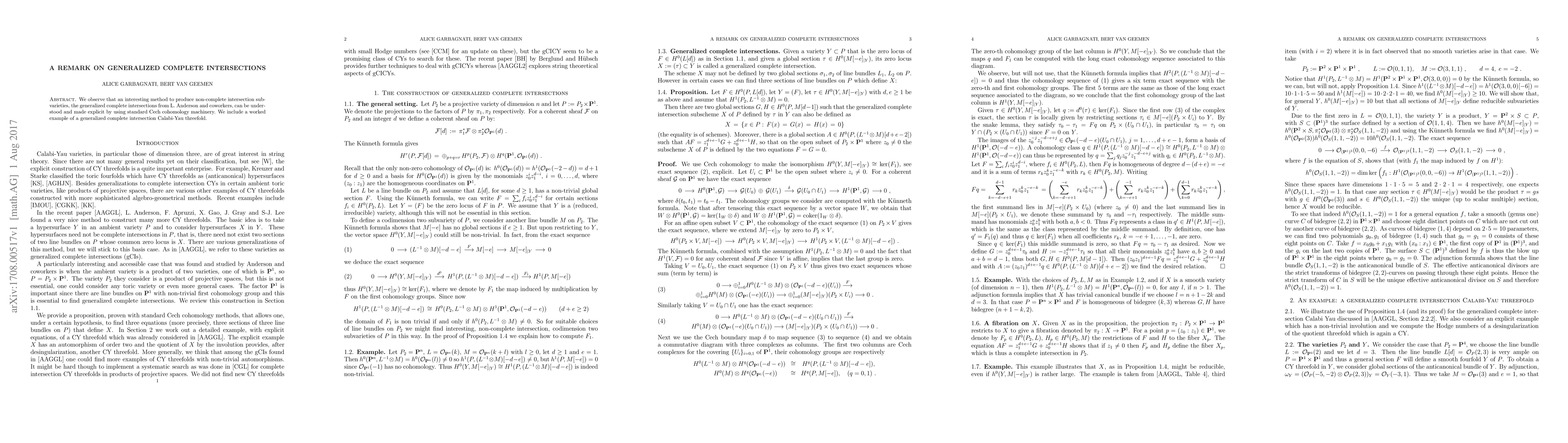 We observe that an interesting method to produce non-complete intersection subvarieties, the generalized complete intersections from L. Anderson and coworkers, can be understood and made explicit by using standard Cech cohomology machinery. We include a worked example of a generalized complete intersection Calabi-Yau threefold.