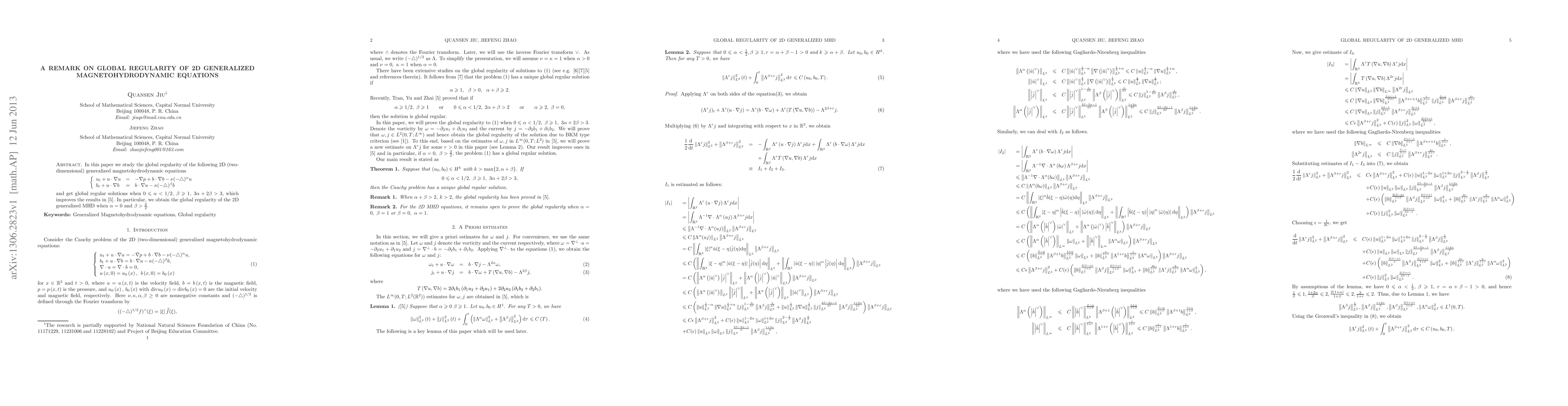 This paper investigates the global regularity of 2D generalized magnetohydrodynamic equations, achieving global regular solutions under specific conditions on parameters α and β, improving upon previous results. The study confirms global regularity when α=0 and β>3/2.