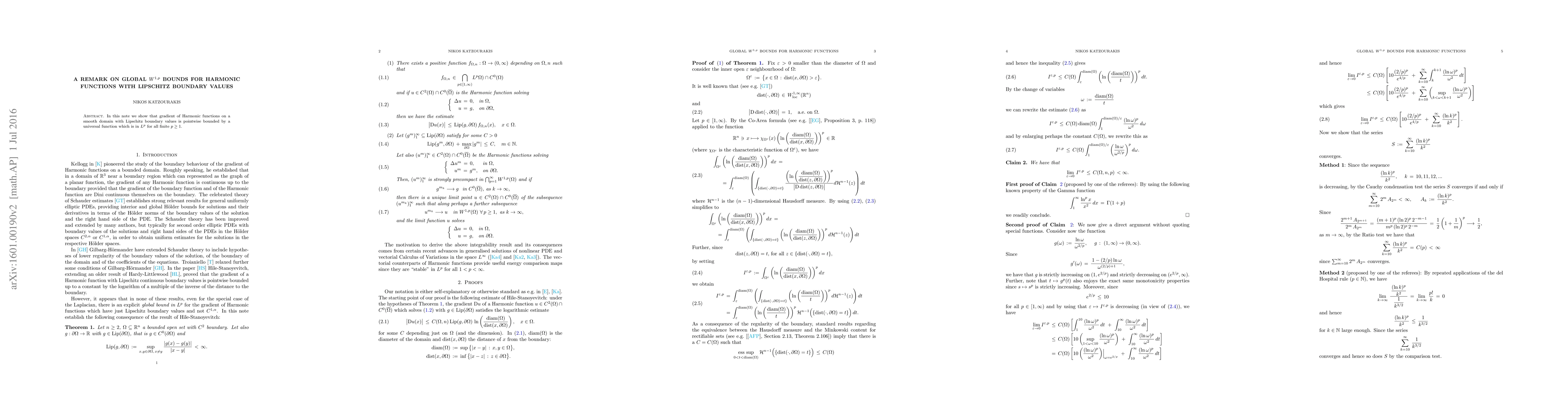 Summary: This paper demonstrates that the gradient of harmonic functions on smooth domains with Lipschitz boundary values is globally bounded by a universal $L^p$ function for all finite $p \geq 1$. The result provides a global $W^{1,p}$ bound for these harmonic functions.
