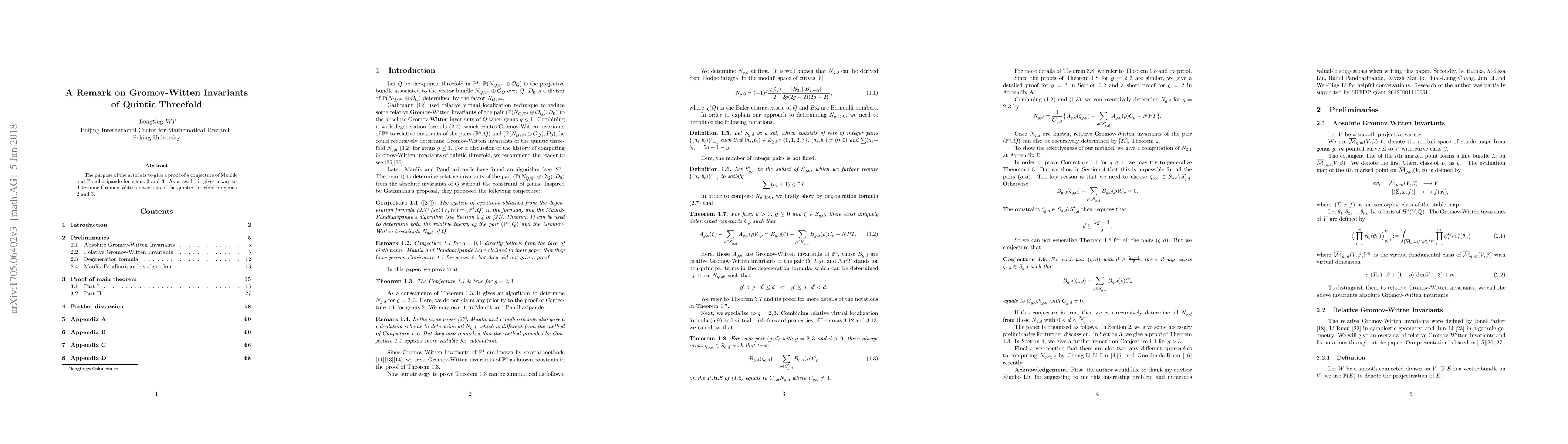 This paper proves the conjecture of Maulik and Pandharipande regarding Gromov-Witten invariants of quintic threefolds for genus 2 and 3, providing a method to determine these invariants.