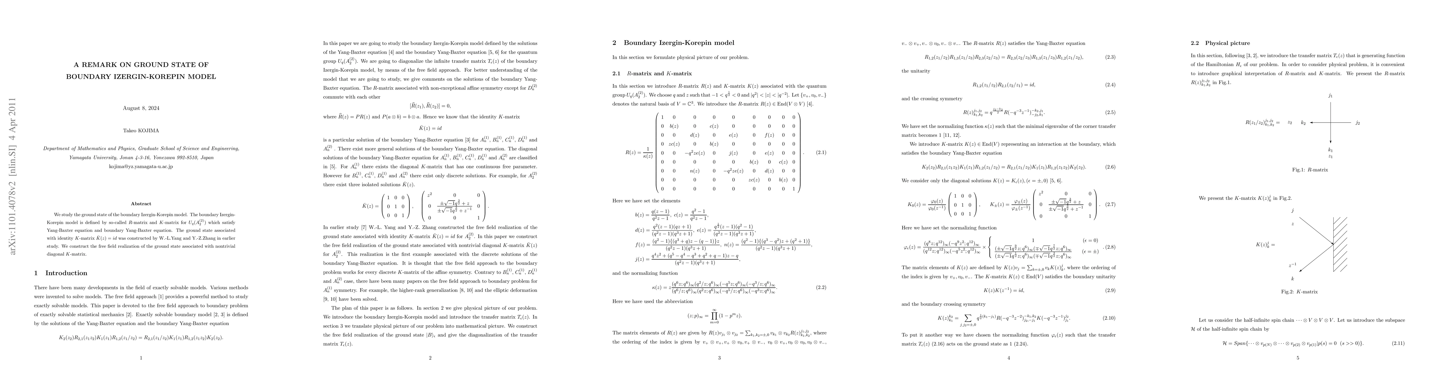 We study the ground state of the boundary Izergin-Korepin model. The boundary Izergin-Korepin model is defined by so-called $R$-matrix and $K$-matrix for $U_q(A_2^{(2)})$ which satisfy Yang-Baxter equation and boundary Yang-Baxter equation respectively. The ground state associated with identity $K$-matrix $K(z)=id$ was constructed in earlier study [Yang and Zhang, Nucl.Phys.B596,495-(2001)]. We construct the free field realization of the ground state associated with nontrivial diagonal $K$-matrix.