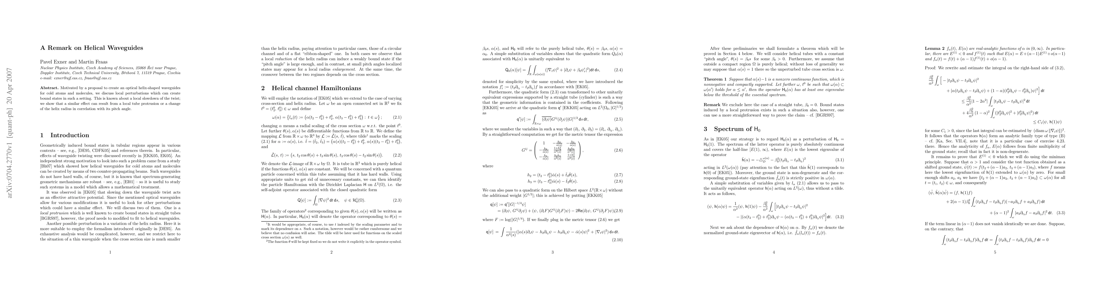 Motivated by a proposal to create an optical helix-shaped waveguides for cold atoms and molecules, we discuss local perturbations which can create bound states in such a setting. This is known about a local slowdown of the twist; we show that a similar effect can result from a local tube protrusion or a change of the helix radius in correlation with its pitch angle.