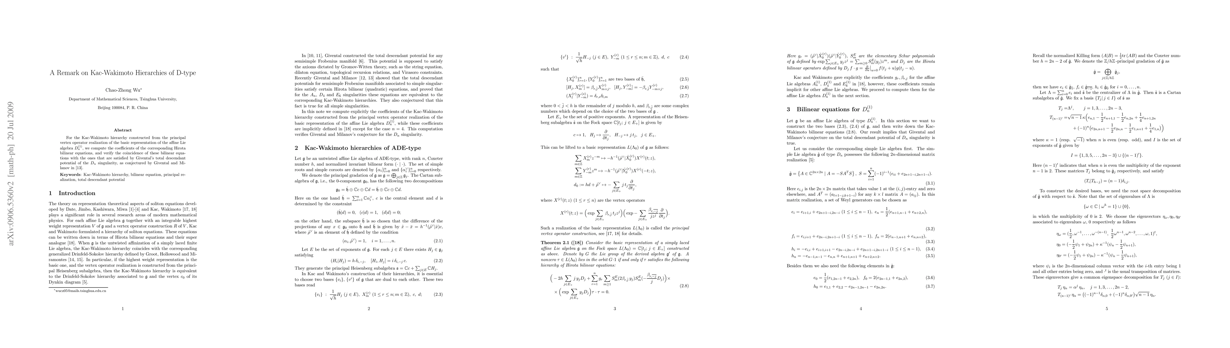 Researchers verified the coincidence of Hirota bilinear equations for Kac-Wakimoto hierarchies with Givental's total descendant potential for the $D_n$ singularity.