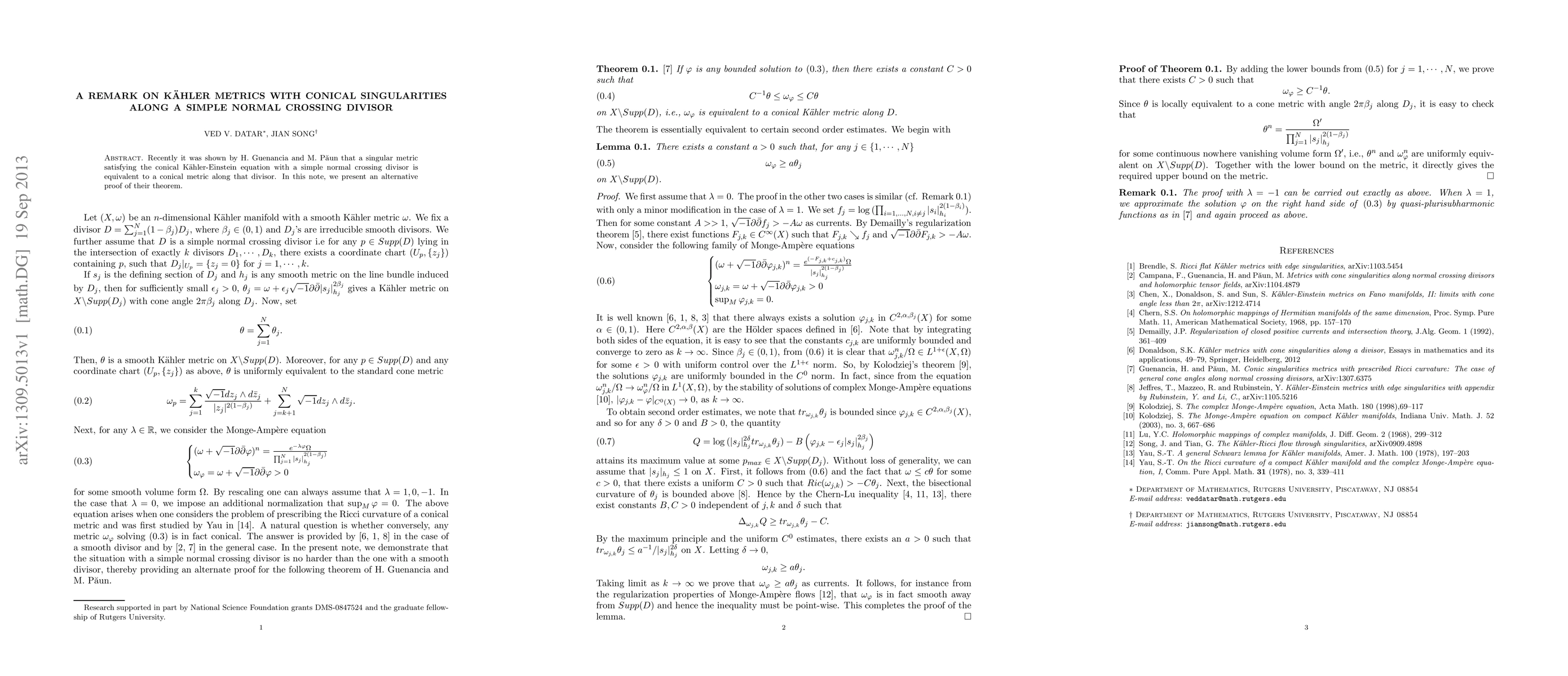 Researchers present an alternative proof that a singular metric with a simple normal crossing divisor is equivalent to a conical metric along that divisor, building on previous work by Guenancia and Paun.
