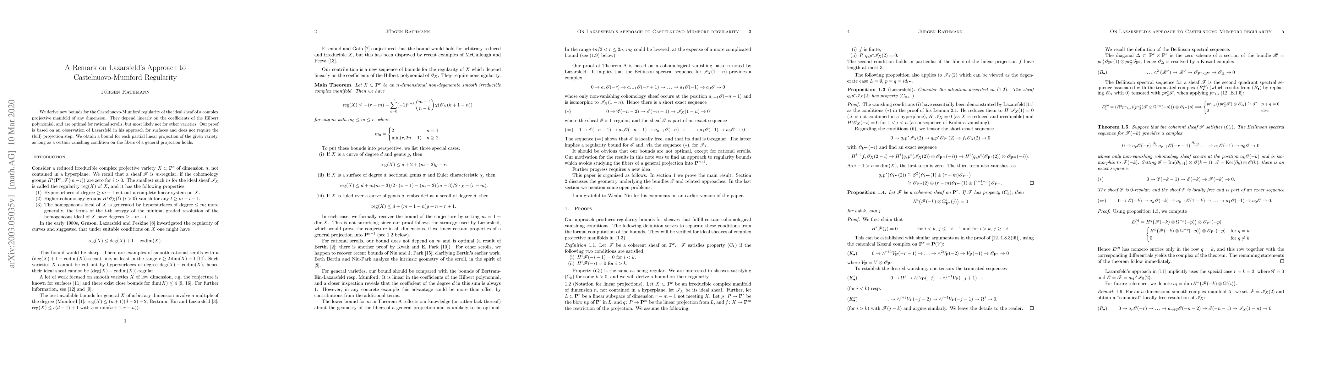 The paper derives new bounds for the Castelnuovo-Mumford regularity of a complex projective manifold's ideal sheaf, utilizing Lazarsfeld's approach and an observation about partial linear projections.