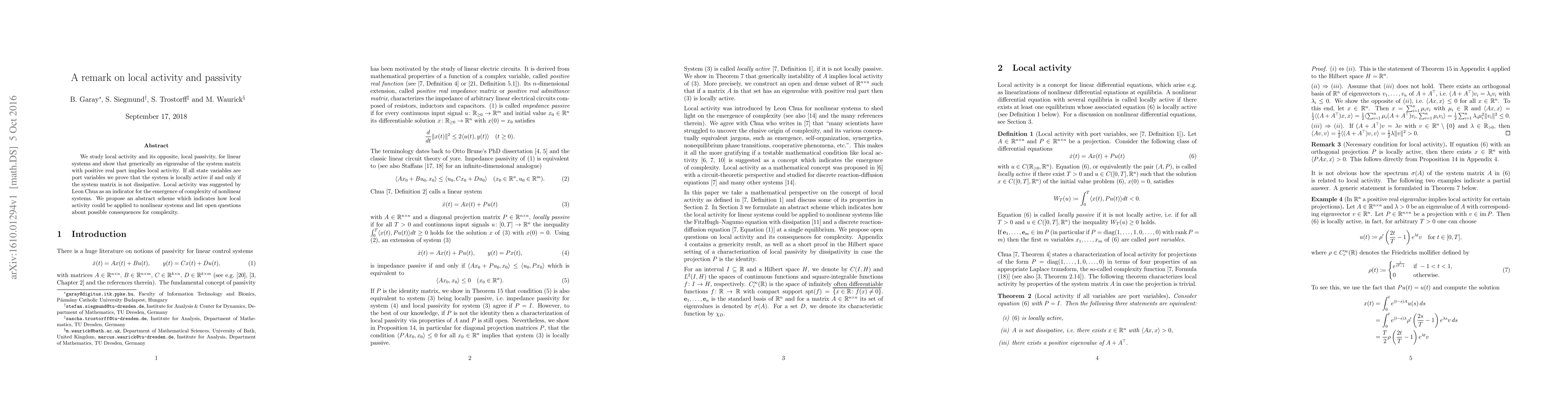 This paper investigates local activity and passivity in linear systems, demonstrating that positive real part eigenvalues imply local activity. It proves that a system is locally active if its matrix is non-dissipative when all state variables are port variables, and proposes a scheme for applying local activity concepts to nonlinear systems, highlighting open questions regarding complexity.