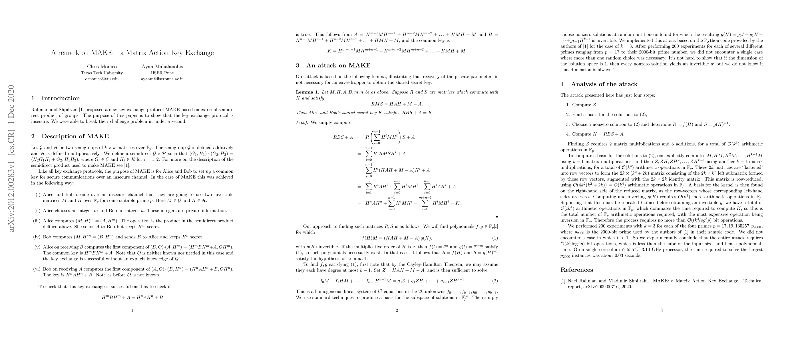 In a recent paper [arXiv:2009.00716], Rahman and Shpilrain proposed a new key-exchange protocol MAKE based on external semidirect product of groups. The purpose of this paper is to show that the key exchange protocol is insecure. We were able to break their challenge problem in under a second.