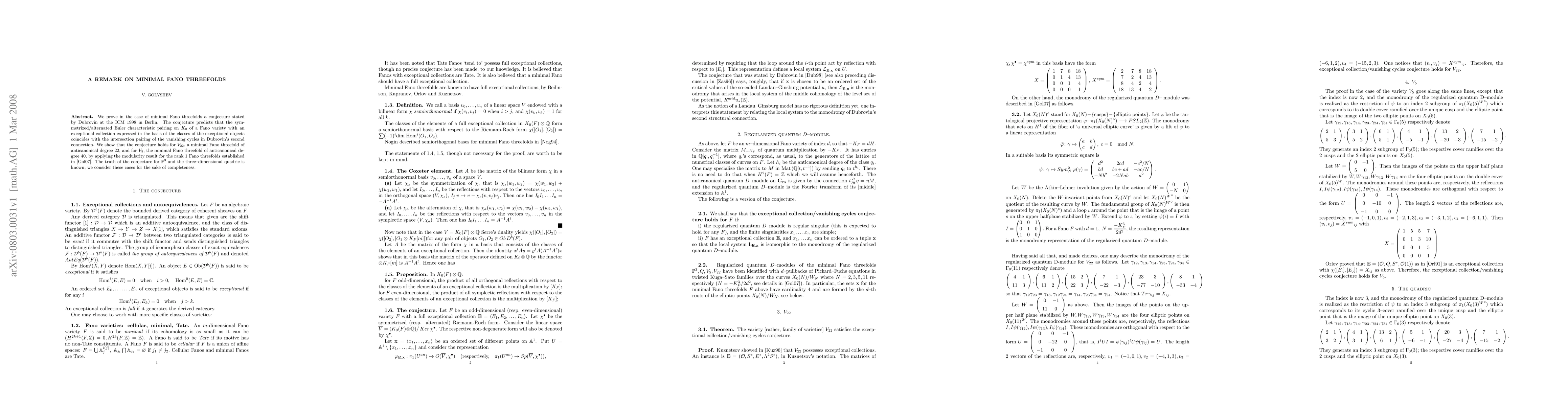 This paper proves Dubrovin's 1998 conjecture regarding minimal Fano threefolds, showing it holds for $V_{22}$ and $V_5$ by using modularity results. The conjecture relates the symmetrized Euler characteristic pairing to the intersection pairing of vanishing cycles in Dubrovin's second connection.