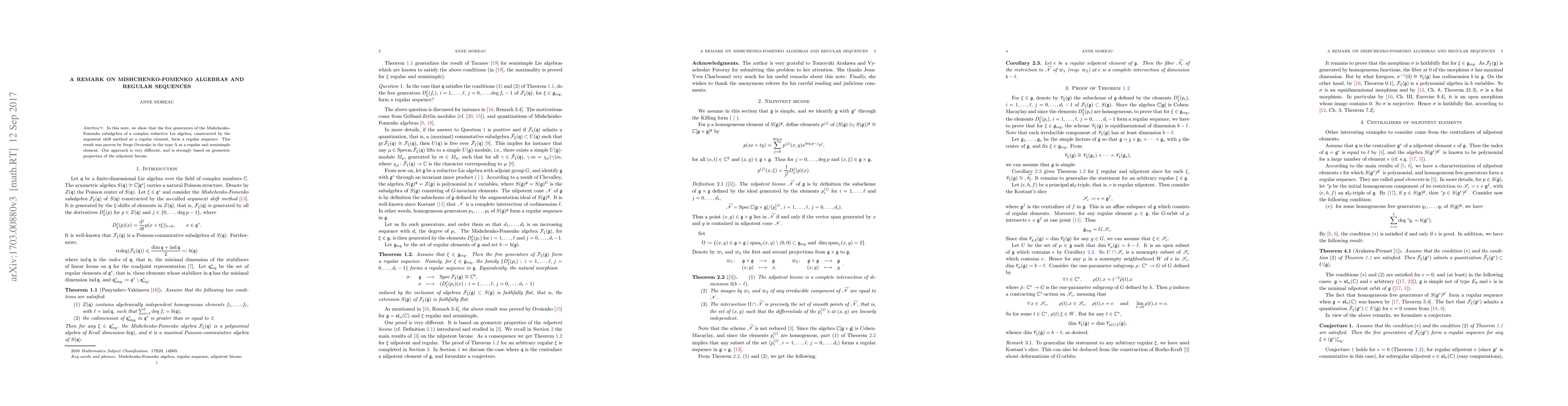In this note, we show that the free generators of the Mishchenko-Fomenko subalgebra of a complex reductive Lie algebra, constructed by the argument shift method at a regular element, form a regular sequence. This result was proven by Serge Ovsienko in the type A at a regular and semisimple element. Our approach is very different, and is strongly based on geometric properties of the nilpotent bicone.