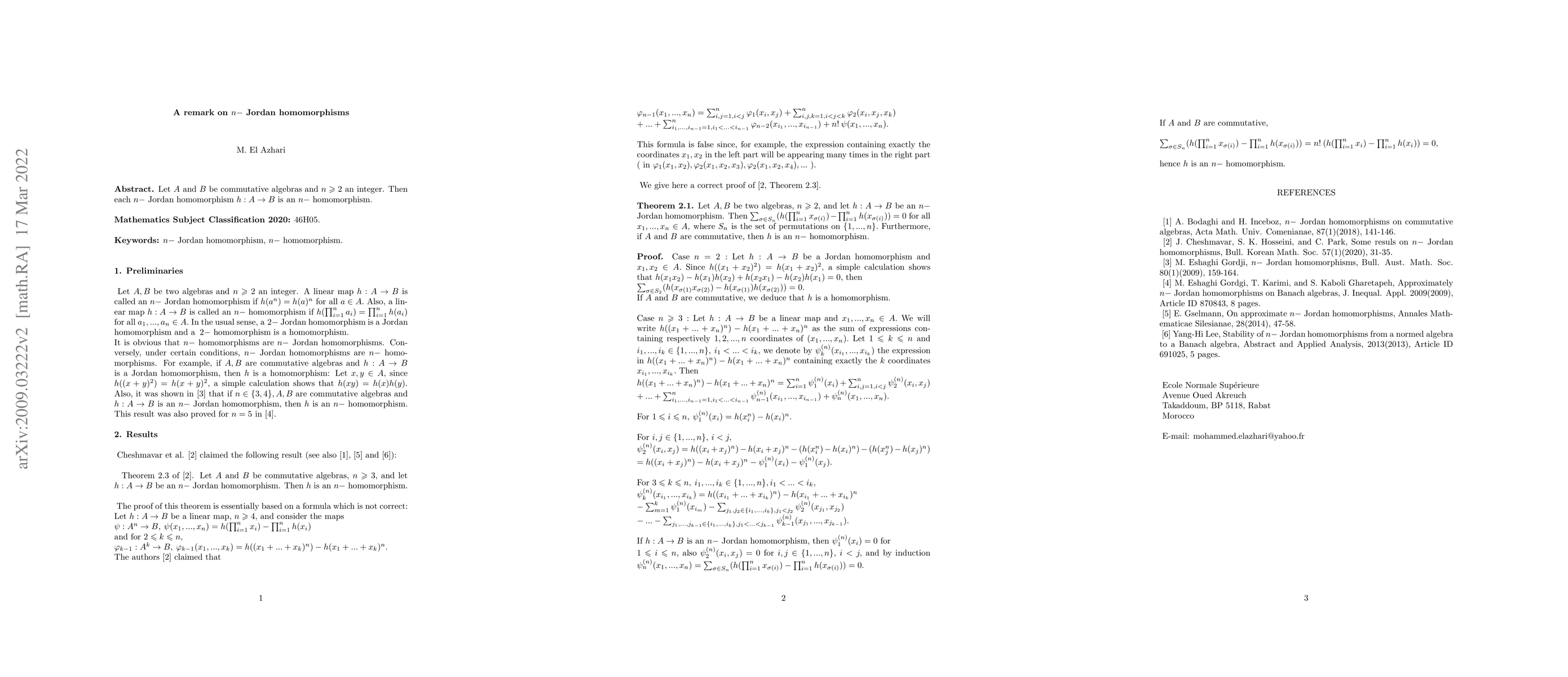 This paper presents a mathematical result showing that any $n$-Jordan homomorphism between commutative algebras $A$ and $B$ (where $n$ is an integer greater than or equal to 2) is also an $n$-homomorphism. The proof likely involves algebraic manipulations and properties of homomorphisms.