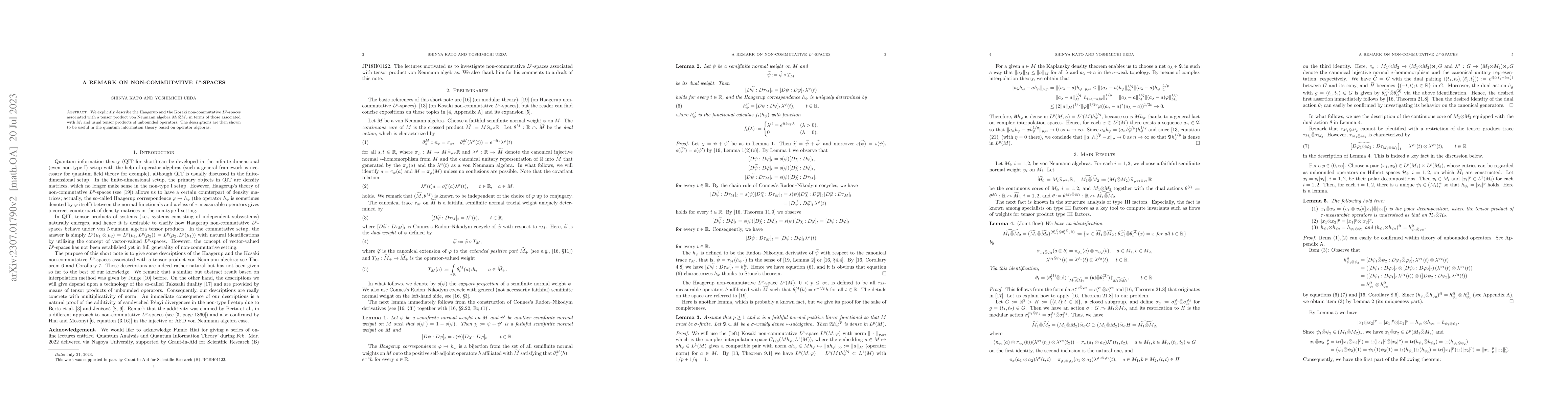We explicitly describe the Haagerup and the Kosaki non-commutative $L^p$-spaces associated with a tensor product von Neumann algebra $M_1\bar{\otimes}M_2$ in terms of those associated with $M_i$ and usual tensor products of unbounded operators. The descriptions are then shown to be useful in the quantum information theory based on operator algebras.