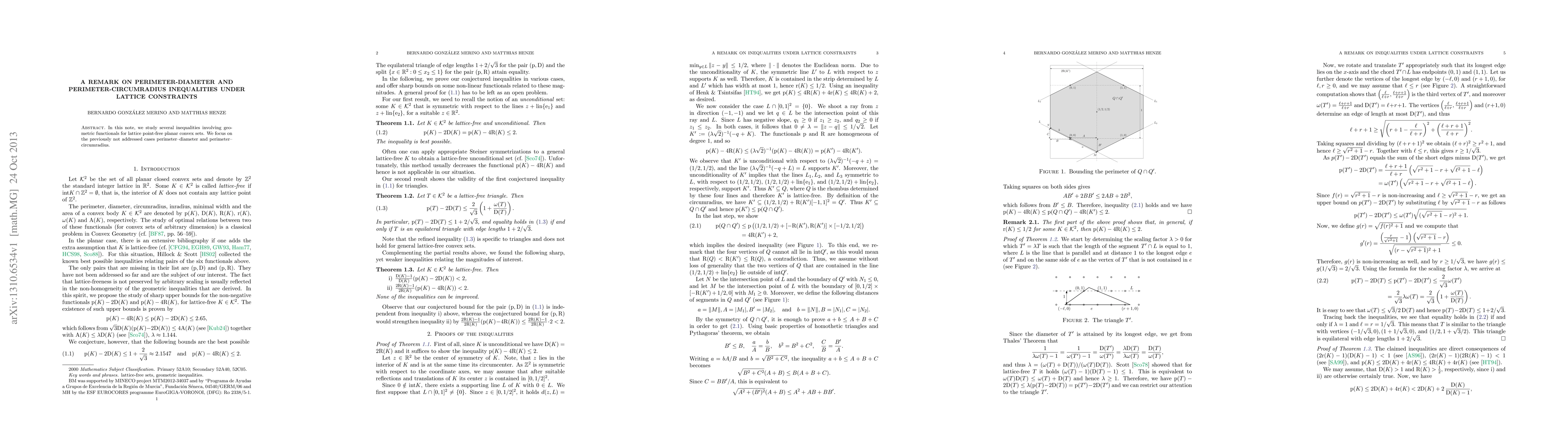 Summary: This paper investigates geometric inequalities for lattice point-free planar convex sets, specifically focusing on the perimeter-diameter and perimeter-circumradius inequalities under lattice constraints. The study addresses cases previously not covered in existing literature.