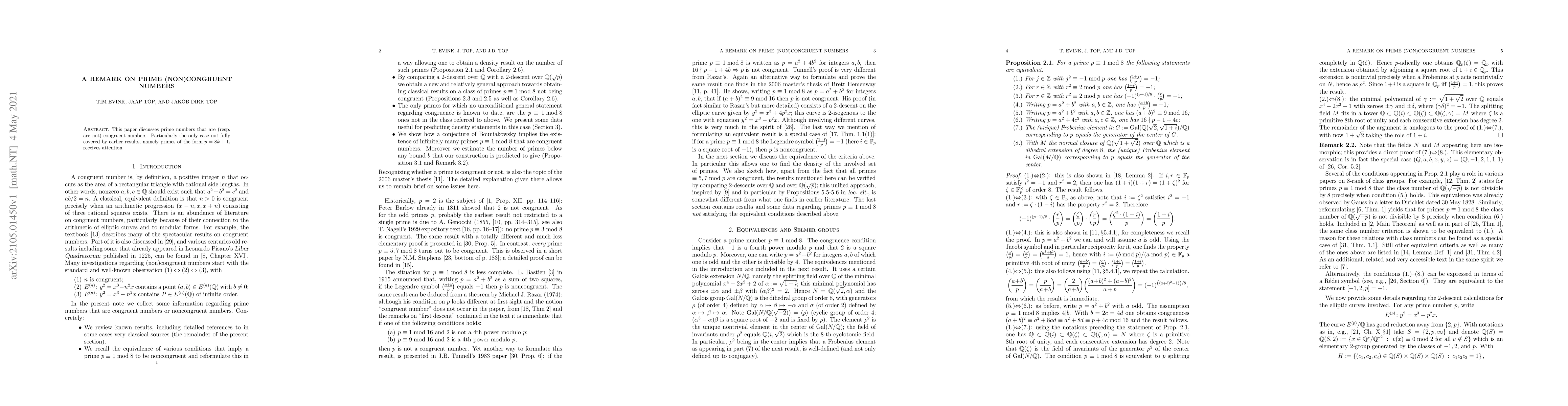 This paper discusses prime numbers that are (resp. are not) congruent numbers. Particularly the only case not fully covered by earlier results, namely primes of the form $p=8k+1$, receives attention.