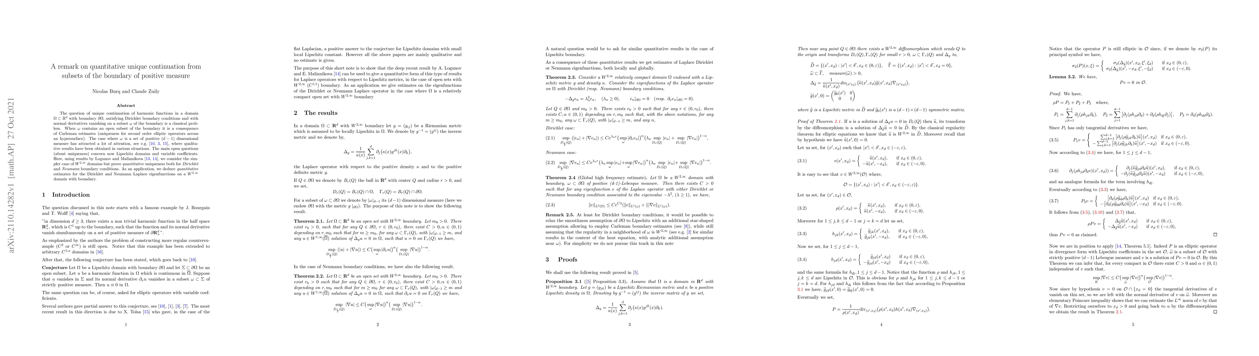 The question of unique continuation of harmonic functions in a domain $\Omega$ $\subset$ R d with boundary $\partial$$\Omega$, satisfying Dirichlet boundary conditions and with normal derivatives vanishing on a subset $\omega$ of the boundary is a classical problem. When $\omega$ contains an open subset of the boundary it is a consequence of Carleman estimates (uniqueness for second order elliptic operators across an hypersurface). The case where $\omega$ is a set of positive (d -- 1) dimensional measure has attracted a lot of attention, see e.g. [10, 3, 15], where qualitative results have been obtained in various situations. The main open questions (about uniqueness) concern now Lipschitz domains and variable coefficients. Here, using results by Logunov and Malinnikova [13, 14], we consider the simpler case of W 2,$\infty$ domains but prove quantitative uniqueness both for Dirichlet and Neumann boundary conditions. As an application, we deduce quantitative estimates for the Dirichlet and Neumann Laplace eigenfunctions on a W 2,$\infty$ domain with boundary.