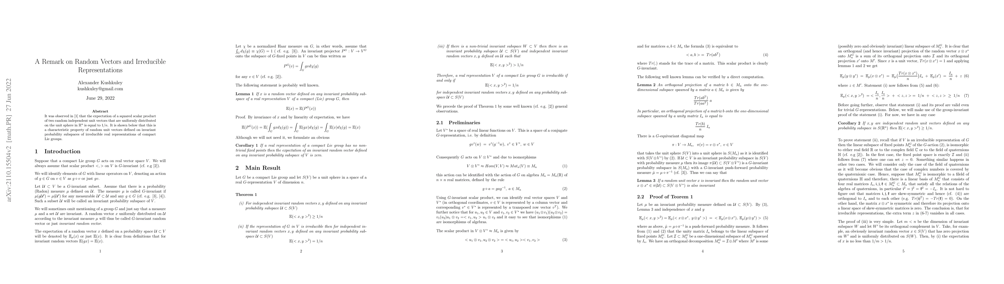 This paper explores the expectation of the squared scalar product of two independent unit vectors uniformly distributed on the unit sphere in $\mathbb{R}^n$, revealing it as $1/n$. It further demonstrates that this property is inherent to random unit vectors in invariant probability subspaces of irreducible real representations of compact Lie groups.