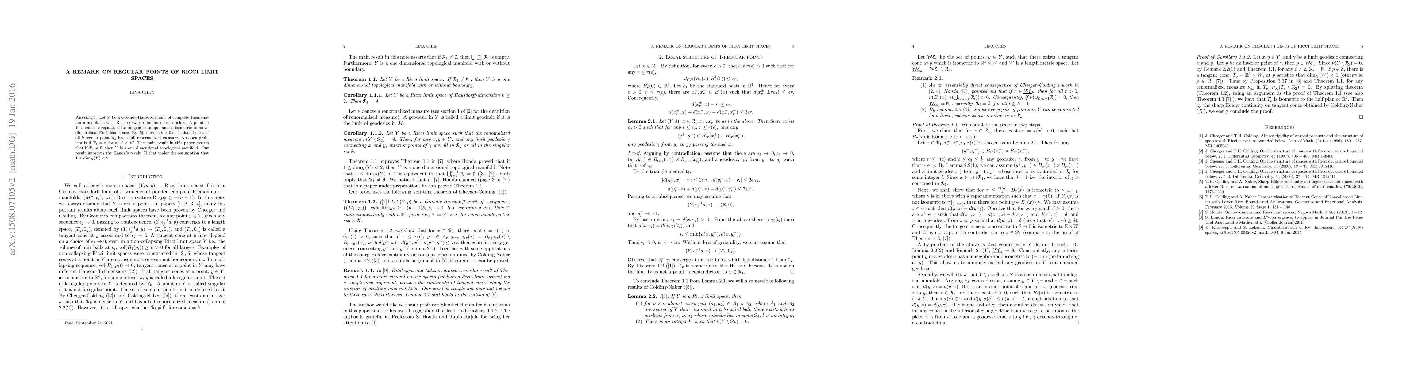 Let $Y$ be a Gromov-Hausdorff limit of complete Riemannian n-manifolds with