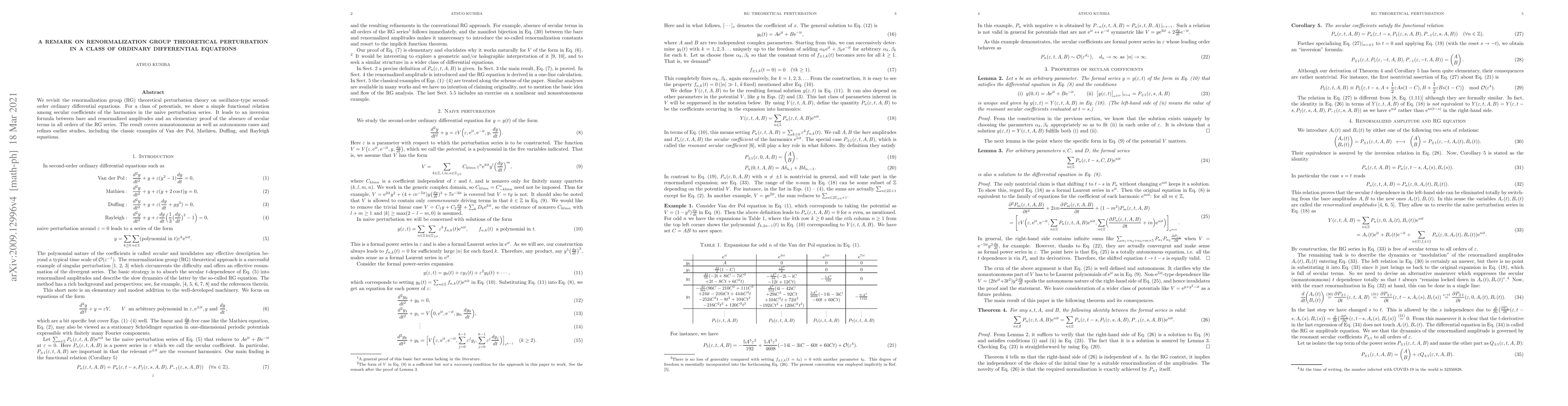 We revisit the renormalization group (RG) theoretical perturbation theory on oscillator-type second-order ordinary differential equations. For a class of potentials, we show a simple functional relation among secular coefficients of the harmonics in the naive perturbation series. It leads to an inversion formula between bare and renormalized amplitudes and an elementary proof of the absence of secular terms in all orders of the RG series. The result covers nonautonomous as well as autonomous cases and refines earlier studies, including the classic examples of Van der Pol, Mathieu, Duffing, and Rayleigh equations.