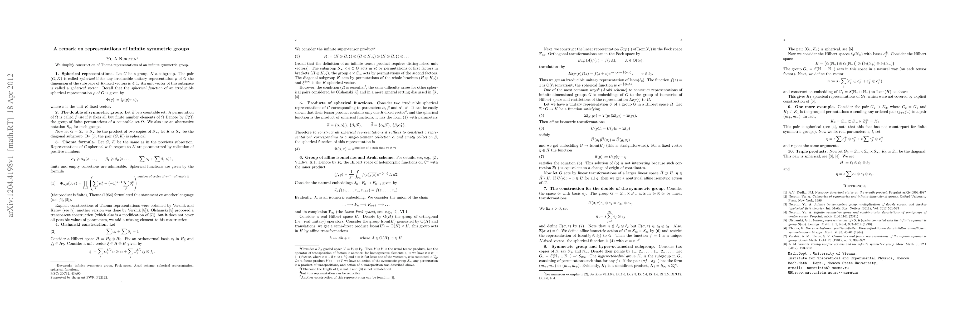 Summary: This paper simplifies the construction of Thoma representations for infinite symmetric groups, providing a more straightforward approach to understanding these complex mathematical structures. The method aims to enhance accessibility and comprehension for researchers in the field.