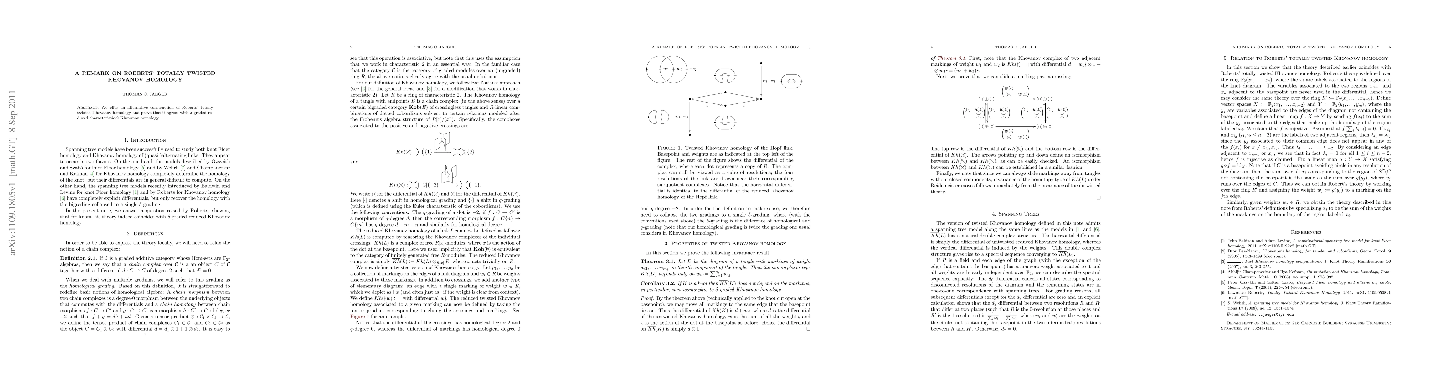 We offer an alternative construction of Roberts' totally twisted Khovanov homology and prove that it agrees with delta-graded reduced characteristic-2 Khovanov homology.
