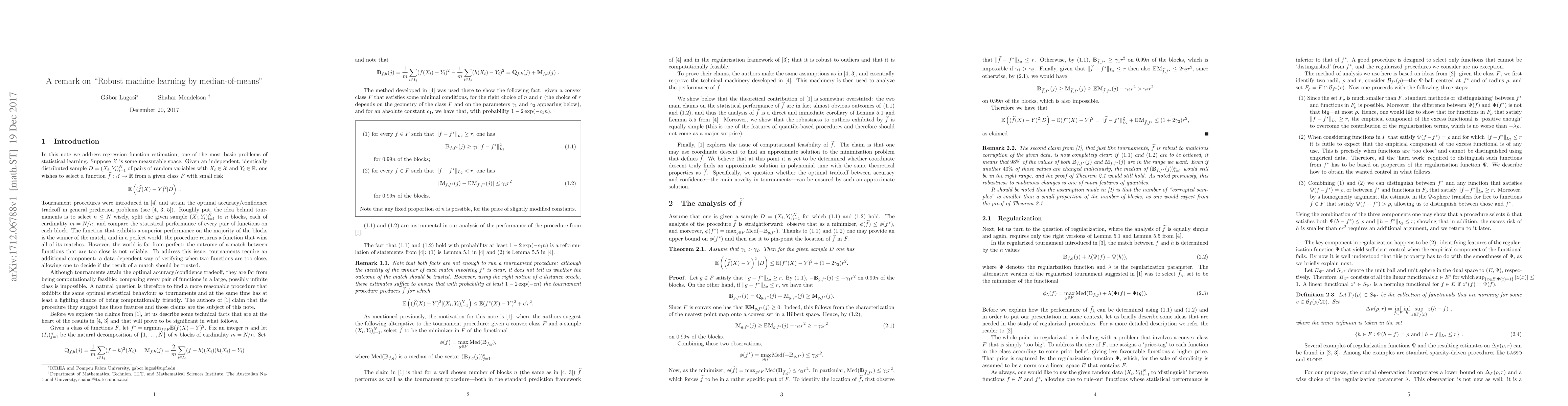 We explore the recent results announced in "Robust machine learning by median-of-means: theory and practice" by G. Lecu\'e and M. Lerasle. We show that these results are, in fact, almost obvious outcomes of the machinery developed in [4] for the study of tournament procedures.
