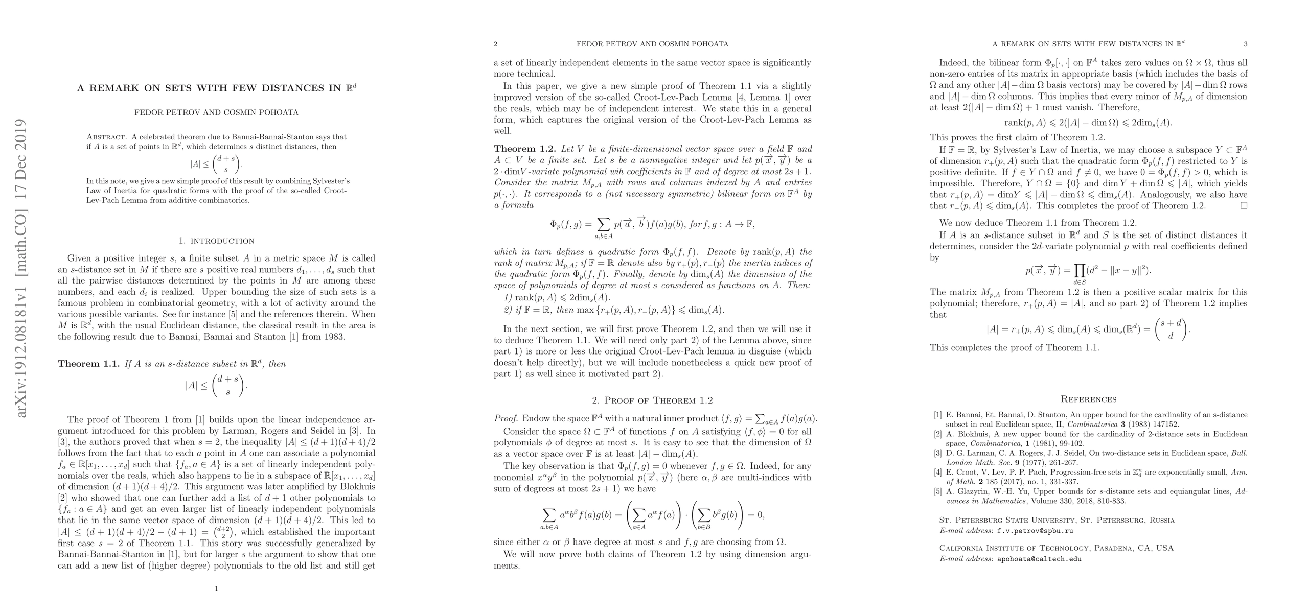 A research paper provides a new proof of Bannai-Bannai-Stanton theorem using Sylvester's Law of Inertia and the Croot-Lev-Pach Lemma, which shows that a set of points in d-dimensional space can have at most {d+s choose s} distinct distances.