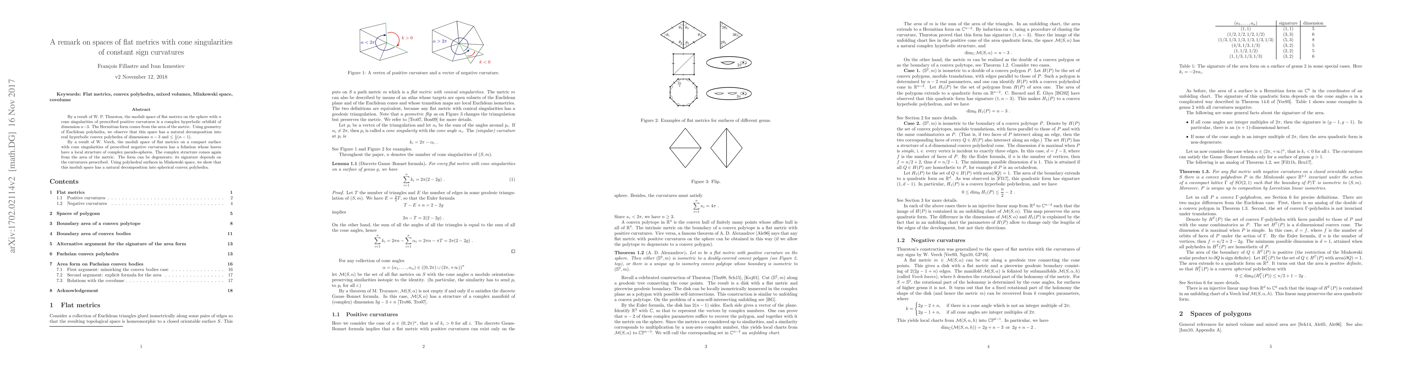 By a result of W.~P. Thurston, the moduli space of flat metrics on the sphere with $n$ cone singularities of prescribed positive curvatures is a complex hyperbolic orbifold of dimension $n-3$. The Hermitian form comes from the area of the metric. Using geometry of Euclidean polyhedra, we observe that this space has a natural decomposition into real hyperbolic convex polyhedra of dimensions $n-3$ and $\leq \frac{1}{2}(n-1)$. By a result of W.~Veech, the moduli space of flat metrics on a compact surface with cone singularities of prescribed negative curvatures has a foliation whose leaves have a local structure of complex pseudo-spheres. The complex structure comes again from the area of the metric. The form can be degenerate; its signature depends on the curvatures prescribed. Using polyhedral surfaces in Minkowski space, we show that this moduli space has a natural decomposition into spherical convex polyhedra.