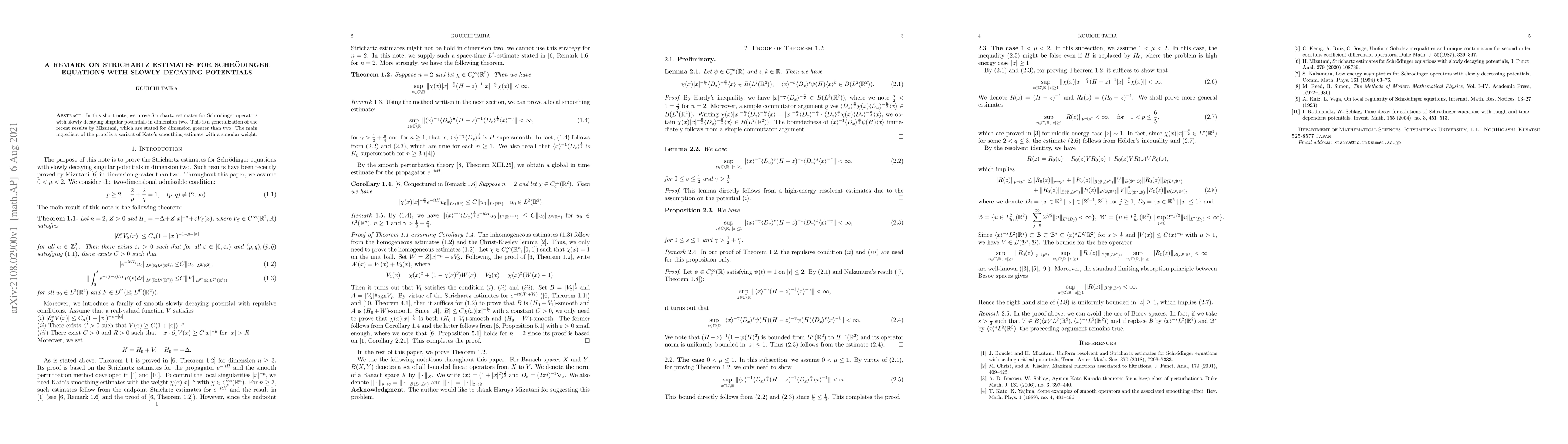 This paper establishes Strichartz estimates for Schrödinger operators with slowly decaying singular potentials in two dimensions, extending previous results by Mizutani for higher dimensions. The proof utilizes a variant of Kato's smoothing estimate with a singular weight.